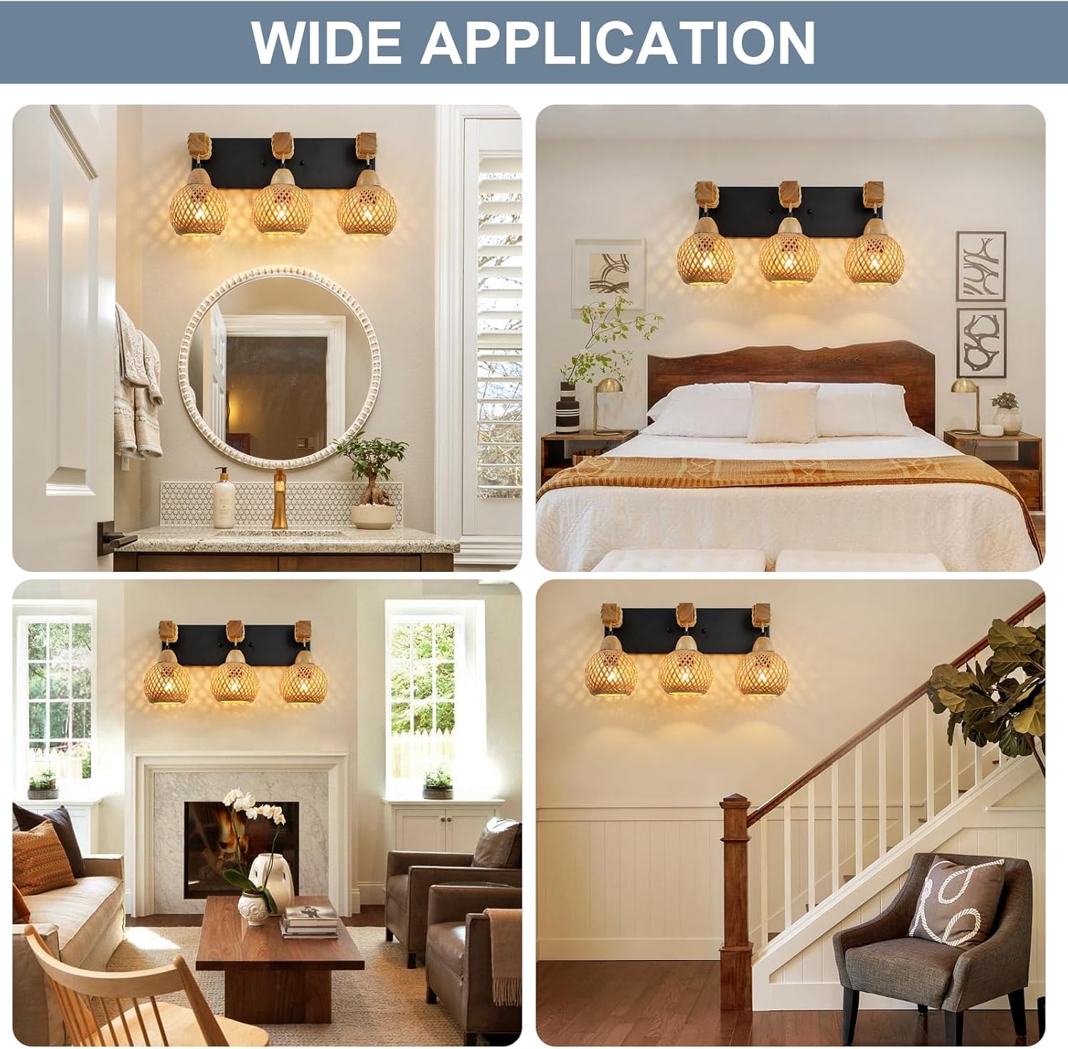 Introducing the 3-Light Bathroom Vanity Light Fixture, a stunning addition to your home decor that effortlessly blends rustic charm with farmhouse elegance. Handcrafted with care, this unique fixture features a beautiful wood base and a handmade bamboo woven boho wicker basket lamp shade, adding a touch of natural warmth to any space.