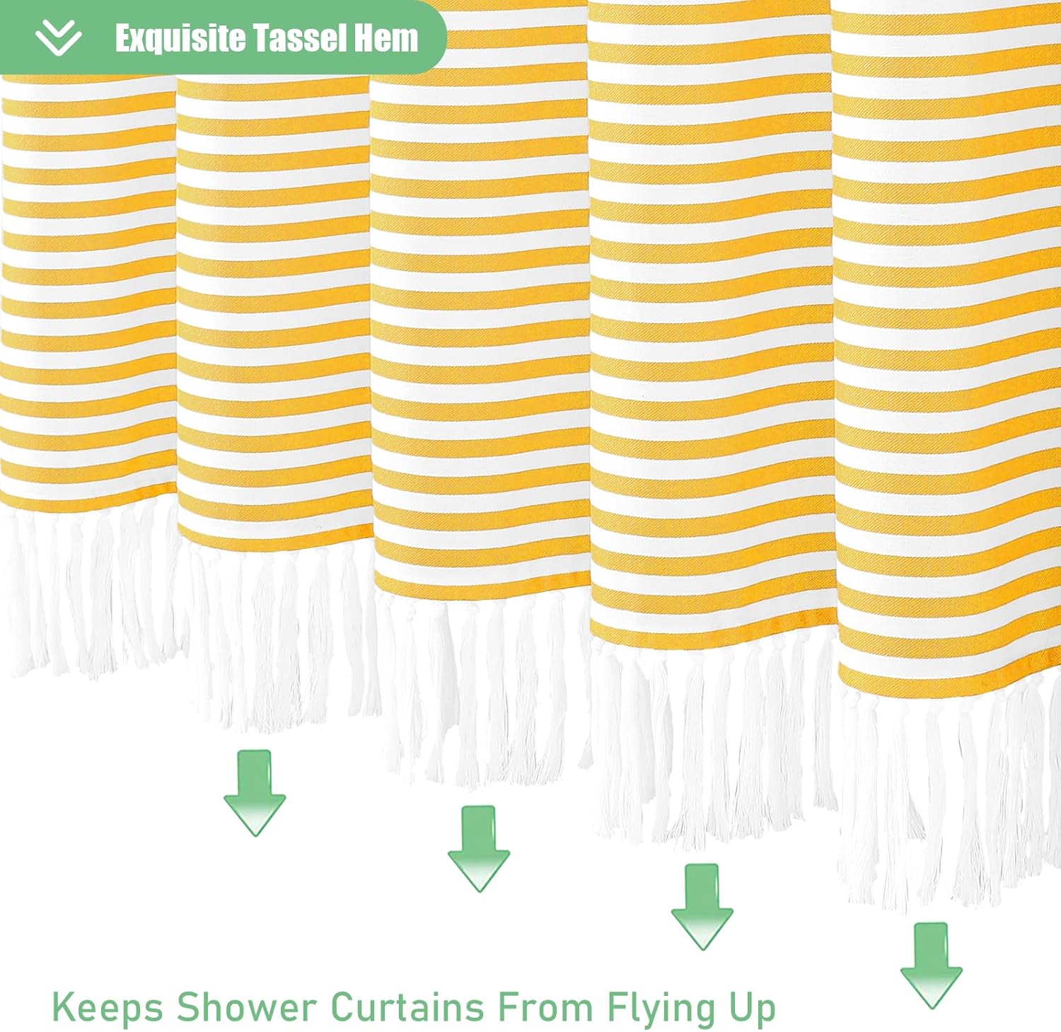 Introducing our Yellow Fabric Shower Curtain, a stunning addition to your bathroom decor that seamlessly blends farmhouse and boho style. This Bohemian Textured Cloth Shower Curtain features charming stripes and delicate tassels for a touch of bohemian flair.